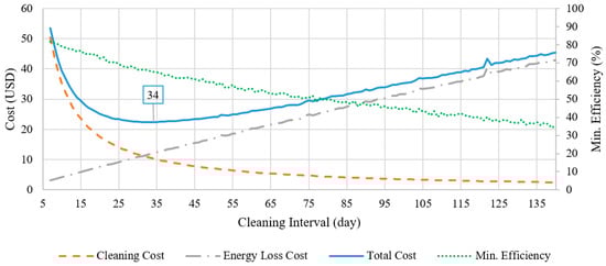 Figure 6b shows the impact of changing the unit cleaning cost when the electricity rate is low (i.e., UAE nationals’ tariff). Although the shifting pattern is similar to the graph in Figure 6a, Figure 6b shows a more flattened total cost curve, implying that determining an optimal cleaning interval may be less critical when the electricity tariff is low.