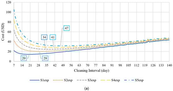 Optimal cleaning intervals for several cleaning costs: (a) expat tariff (Cases S1–5exp) and (b) UAE national tariff (Cases S1–5exp).