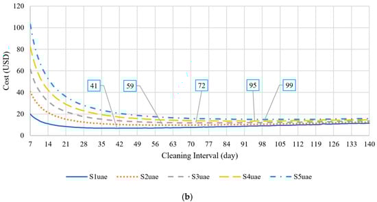 For Cases S1–5uae (the tariff for UAE nationals) in Figure 6b, the results show a similar pattern to those in Cases S1–5exp: a higher unit cleaning cost results in a longer cleaning interval. However, the optimal cleaning intervals for UAE national tariff cases are much longer than those for expats’ tariff cases, ranging from 41 to 99 days. Thus, it still might be financially viable for UAE nationals to delay cleaning and buy energy from the grid to compensate for the lost energy if needed.