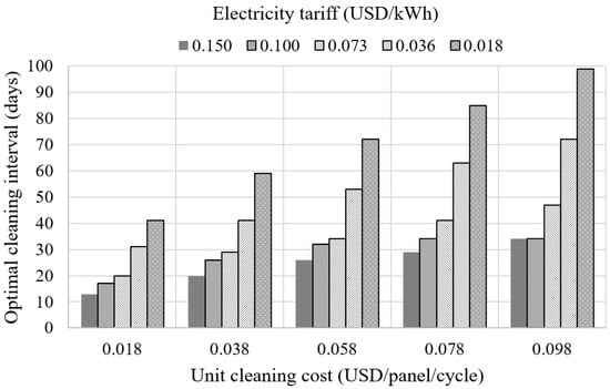 A sensitivity analysis regarding cleaning costs and electricity tariffs is illustrated in Figure 7. As can be seen from the chart, more frequent cleaning is required when the unit cleaning cost is lower and the electricity tariff is higher, and vice versa.