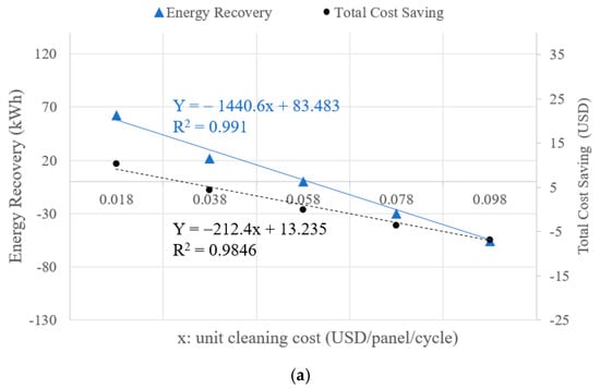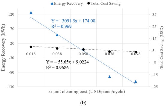 A linear regression analysis was conducted based on the results of the expat’s electricity tariff cases from Table 6, as presented in Figure 8a. The dependent variable is energy recovery in kWh, and the independent variable is the unit cleaning cost (see the solid line and triangle marks). Their relationship shows a strong linear relationship of y = −1440.6x + 83.483 with an R2 of 0.9913. The slope of −1440.6 implies that when the unit cleaning cost decreases by USD 0.01, the energy recovery could reach 14.40 kWh in a single PV panel over a 20-year period. Similarly, when the dependent variable is the total cost savings and the independent variable x is the unit cleaning cost, a strong linear relationship is also observed, expressed as y = −212.4x + 13.235 with an R2 of 0.9846 (see the dotted line and circle marks). Thus, reducing the unit cleaning cost by USD 0.01 would result in a total cost savings of USD 2.12 for one PV panel over a 20-year period.