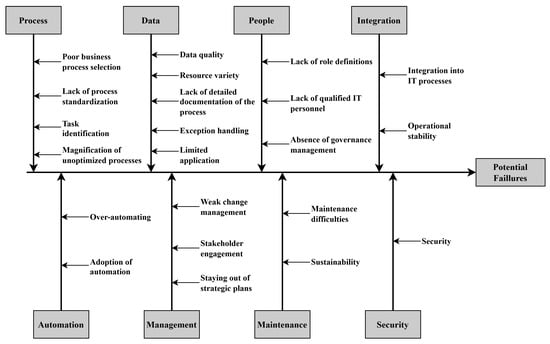 Despite the widespread adoption of RPA worldwide, RPA adoption challenges are multidimensional in their technical, strategic, operational, and human aspects []. According to EY research, 30% to 50% of first RPA projects fail. For example, robots used in the complaint process caused a pile of complaints due to coding errors, and robots used in the accrual process caused significant under-reporting of accruals due to incorrect rule set definitions in bots []. As automation is rolled out across the industry, many examples of non-performance issues are a gray area for the deployment and investigation of technology causes []. Because of this, potential risks need to be considered.