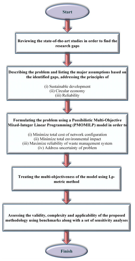 Based on the above-stated requirements, this research attempts to build up a novel Possibilistic Multi-Objective Mixed-Integer Linear Programming (PMOMILP) approach to establish a circular–sustainable–reliable WMS, under uncertainty, where the key contributions are explained below: