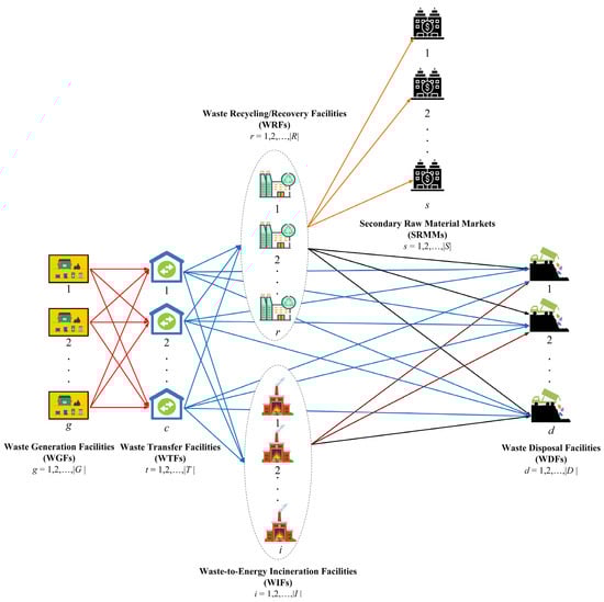 With respect to the initial research endeavors within the literature, we can refer to those addressing the operational challenges of MSW management. For instance, a periodic Vehicle Routing Problem (VRP) was offered by Shih and Lin [6] to optimally collect and transfer medical waste from hospitals. The other researchers have also applied different versions of VRP to formulate the MSW collection problems, mainly focusing on minimizing total collection/transportation costs [7,8,9]. The main drawback of these studies is their oversight of the importance of strategic and tactical decisions in shaping the overall efficacy of the WMS. Due to this, a major part of the literature is dedicated to the efforts made for designing a thorough WMS, such as MSW network configuration. On the other hand, Multi-Criteria Decision Analysis (MCDA) and multi-objective optimization are known as two main tools to deal with MSW management in the literature. In most MCDA studies, the aim is to rank a list of alternatives subject to a set of criteria as solutions to MSW problems [10,11]. However, the majority of multi-objective optimization studies try to first formulate the MSW problems and provide optimal or near-optimal solutions with detailed information about the network configuration.