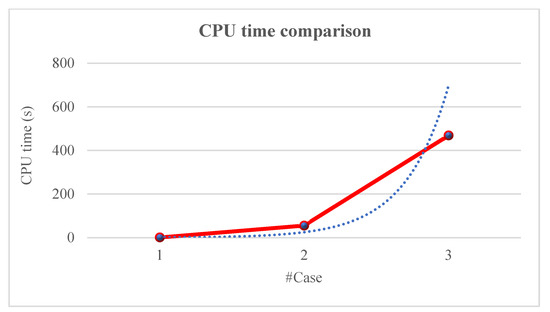 The last column of Table 4 shows that the solver achieved zero absolute gaps in all cases. Figure 4 represents the upward trend of CPU times for the three numerical cases, with a CPU time of 174.70 s, on average. Here, the blue dashed line stands for the trendline. This figure illustrates an exponential growth in CPU time, indicating the high complexity of the problem. Consequently, for larger scales, the CPU time needed may exceed several hours, highlighting the need for approximate-solution algorithms to manage the complexity.