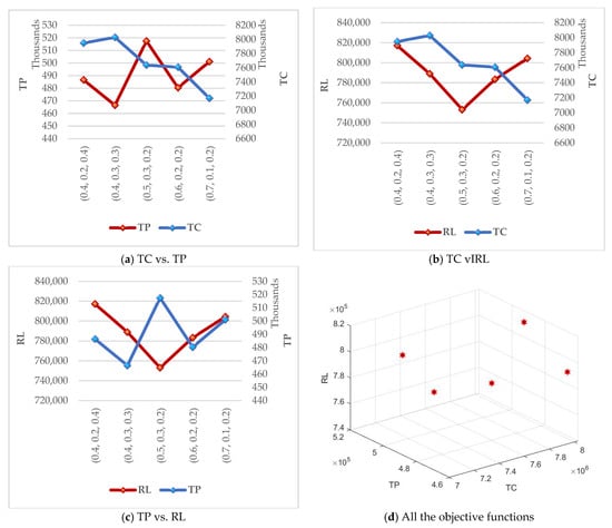The Lp-metric method is used in the proposed DSS model as one of the widely-recognized techniques in the literature [28,29]. The goal is to assess the efficacy of the suggested PMOMILP model through a single objective function. Initially, it is necessary to individually tackle the model with each objective function and attain the ideal values of , , and , which are represented as , , and , respectively. According to the Lp-metric method, three weights of , , and are defined for , , and , respectively. Finally, the single-objective model is built up as follows: