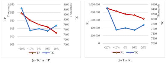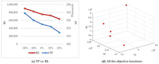 In accordance with the results attained from the sensitivity analysis, it is observed that various levels of ( and caused diverse fluctuations in the objective functions. It shows that the instability of practical scenarios can directly impact the problem and alter the optimal policy. As expected, assigning higher weights to the objective functions led to better values. As an example, the best value of the total cost is 7,169,560.629, which is provided by (. On the other hand, there is no estimation of the behavior of the objective functions versus the fluctuations of . For example, raising this parameter by 10% led to attaining the best value of the total cost. This is also the case for the other objective functions. As expected, the system reliability has an indirect relation with , wherein diminishing this parameter increased the reliability. Surprisingly, this is the case for the second objective function. As observed, increasing caused a significant reduction in the total amount of environmental pollution, wherein the maximum change occurred at the −20% change interval. Therefore, we can conclude that optimal tuning of for the calculations provides appropriate values for the second and third objective functions; i.e., total environmental and system reliability, respectively. Moreover, an acceptable value can be also achieved for the first objective function, in this regard. For instance, led to an improvement in all objective functions in comparison with . In summary, policy-makers and managers have to evaluate the volume of available resources in the WMS to account for fluctuations that frequently take place in the real world, such as pandemics.