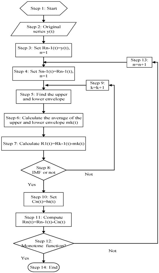 The EEMD method is a noise-assisted analysis technique designed to address the modal mixing issue commonly encountered with the EMD method. The fundamental principle of EEMD is to decompose the original data series into a finite number of intrinsic mode functions (IMFs). These IMFs are beneficial because they reveal fluctuation information at various scales, allowing for a more intuitive observation of these fluctuations. The specific steps of the EEMD method are as follows: