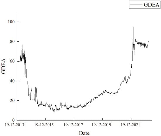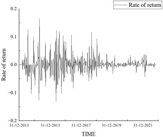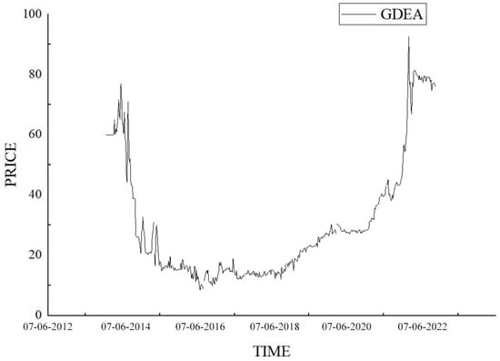 In this research, the price of carbon emission rights in Guangdong (GDEA) serves as the main variable under examination. To evaluate the returns and volatility within the carbon emission market, we utilize the closing prices of Guangdong’s carbon emission rights. Our dataset includes these prices from 19 December 2013 to 13 March 2023, recorded every trading day, culminating in 1975 observations in total, as depicted in Figure 2.