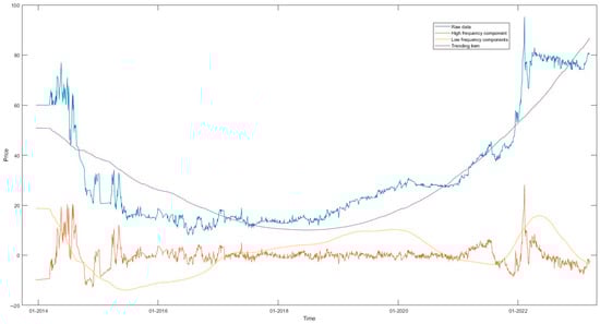The data are selected from the carbon emission rights prices between 19 December 2013, and 13 March 2023 from Figure 4. Given the extensive span of the data, this study facilitates a comprehensive analysis of the characteristics of carbon emission rights market development in Guangdong. The correlation coefficient between the trend component and the original sequence is 0.92, indicating a strong relationship. Moreover, the trend component accounts for 82.22% of the variance in the original sequence, underscoring its significant explanatory power and representing 90.19% of the total variance after modal decomposition.