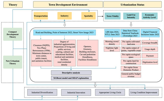 Previous studies have used crowd aggregation within defined spatial boundaries to assess vitality [33]. Meanwhile, NTL data provide fundamental insights into regional economic development, population activities, and transportation flow, generating a proxy indicator for the gross domestic product (GDP) growth. Its coverage and information are broader, offering a more comprehensive and objective reflection of economic activity levels. Thus, crowd density and temporal changes in lighting facilities can be regarded as dependent variables representing town vitality. To explore the impact of town development environment features on town vitality, this study employs the morning crowd density of LBS daytime points and NTL intensity as proxy indicators. Further, recognizing that transportation, economy, and location are the primary determinants affecting the extent of town populations’ hollowing-out [12], we selected 15 important development environment features for town areas as independent variables based on the previous literature. These indicators, representing the town development environment, were categorized into three dimensions, namely, transportation, industry, and spatiality, and they are detailed in Section 3.3. Initially, we used descriptive analysis of urbanization status data to look at the raw data patterns. Subsequently, we employed the XGBoost model to explain the nonlinear relationship in more detail between multiple development environment variables and vitality variables. We introduced the Shapley additive explanation (SHAP) to elucidate the detailed mechanisms of different variables, thus assessing the contribution of development environment indicators to town vitality more accurately. Last, guided by the relative importance and nonlinear effects, our study presents effective territory spatial planning and strategies for promoting urbanization and prosperity. These strategies cover industrial innovation and diversification, appropriate living circle planning, and improvement of living conditions, thus achieving the goals set by the government (Figure 1). It is important to note that, XGBoost-SHAP is not only a powerful predictive tool but also a method that allows us to quantify and interpret complex relationships between town development characteristics and vitality. This approach contributes to the urbanization theory by offering a data-driven perspective on urban vitality drivers, highlighting nonlinear relationships and interactions that traditional methods may overlook. The machine learning-based framework aligns with the principles of the smart city development and New Urbanism theory. By identifying key predictors of vitality and exploring their interactions, this study provides actionable insights for urban planners aiming to foster sustainable, vibrant towns.