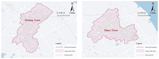 In this study, to investigate the impact mechanisms, significance, and interactions of development environment factors influencing the town vitality in rural areas, Zhitang Town and Shaxi Town in Suzhou City, Jiangsu Province of China, were chosen as the research areas (Figure 2 and Figure 3). Suzhou City was selected due to its rapid urbanization and economic development, making it a valuable case for studying crowd vitality and urbanization dynamics. Both towns are situated in the densely populated area of Suzhou, undergoing rapid economic development. They are part of the relatively developed Yangtze River Delta (YRD) Economic Zone and can represent the characteristics of urbanization and vitality in this region to some extent. They represent varying degrees of industrial agglomeration, urban infrastructure, and socio-economic characteristics, allowing us to capture a more comprehensive view of how different development environments impact crowd behavior. By selecting towns with distinct profiles, we aim to enhance the study’s generalizability within similar urbanizing regions.