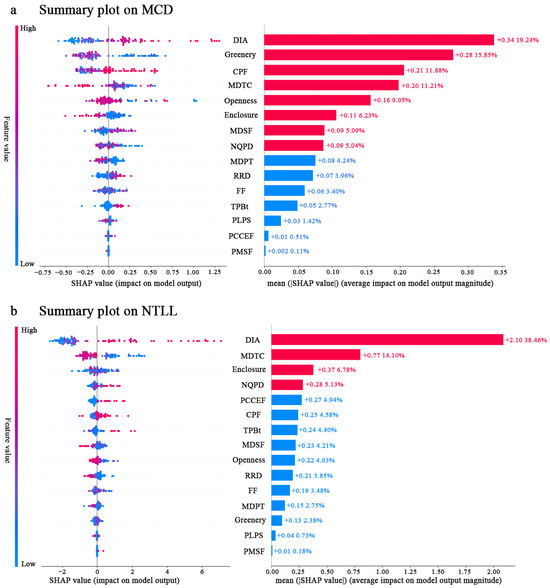 Local and global feature importance plots by SHAP. ((a) shows the local feature importance plot for MCD on the left and global feature importance plot on the right for MCD; (b) shows the local importance plot for NTLL on the left and global feature importance on the right for NTLL).