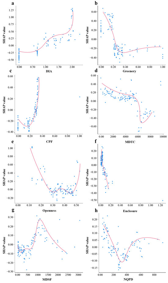 The nonlinear effects of key secondary variables on MCD. ((a) shows how the SHAP value for DIA changes with its own value; (b) shows how the SHAP value for Greenery changes with its own value; (c) shows how the SHAP value for CPF changes with its own value; (d) shows how the SHAP value for MDTC changes with its own value; (e) shows how the SHAP value for Openness changes with its own value; (f) shows how the SHAP value for Enclosure changes with its own value; (g) shows how the SHAP value for MDSF changes with its own value; (h) shows how the SHAP value for NQPD changes with its own value. The blue dot represents the prediction for a specific data point, while the red line represents a fitted line for the trend).