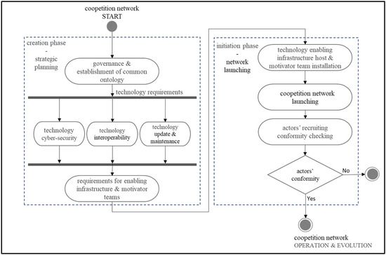 The initiation stage of coopetition networks for value co-creation is the starting phase. It can be subdivided into creation and initiation phases, each with distinct objectives and activities (Figure 2).