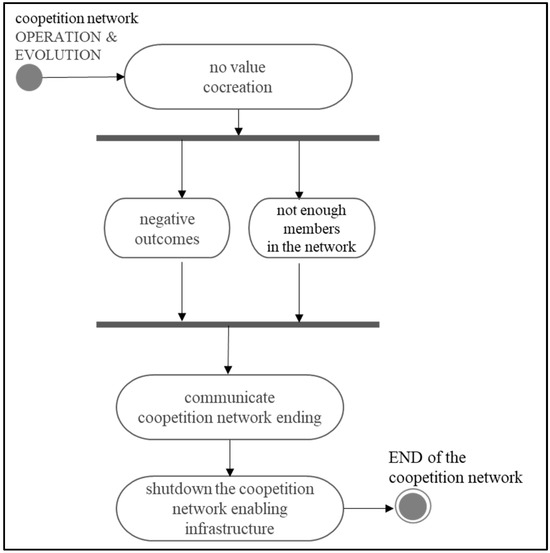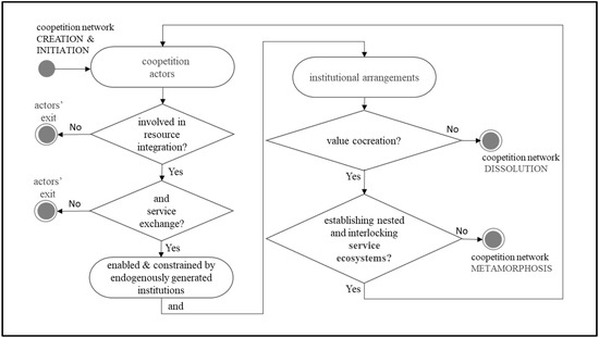 Among other reasons behind a coopetition network starting a metamorphosis stage, the reasons may comprise the following: (1) Network reshaping: A coopetition network undergoes a transformation or reshaping process. This transformation is triggered when the existing institutions and institutional arrangements within the network cannot establish the desired nested and interlocking service ecosystems; (2) Identifying the need for change: The network’s leadership and stakeholders recognize the need for change. This recognition may stem from challenges in achieving the intended service ecosystems, changes in market dynamics, or other factors affecting the network’s performance; (3) Strategic planning: A new strategic plan addresses the identified issues and challenges. This plan outlines the changes, improvements, or innovations needed to enhance the network’s competitiveness and value creation capabilities; (4) Improving key components: The strategic plan may focus on various aspects, including technology enhancements, governance adjustments, ontology refinement, and other relevant issues. These improvements aim to boost the network’s capacity to create value through service ecosystems; (5) Reactivation of network infrastructure: Once the strategic planning phase is completed, the network-enabling infrastructure is reactivated. This involves implementing the technological, structural, and organizational changes outlined in the strategic plan; (6) Re-launching: The network undergoes a re-launching phase with the updated infrastructure. This phase signifies the network’s readiness to operate under the new strategic framework; (7) (Re)Initiation Steps: The (re)initiation steps are carried out to ensure that all actors and stakeholders are aligned with the revised plan. This may involve recruiting new participants, reaffirming commitments, and conducting interoperability and cybersecurity checks to ensure compliance with the updated technology requirements. In summary, the metamorphosis stage is a pivotal phase in the life of a coopetition network for value co-creation. It involves adapting the network’s strategy, technology, governance, and ontology to respond effectively to changing market conditions and trends. By embracing these adaptations, the network aims to remain competitive and continue its mission of value creation through service ecosystems.