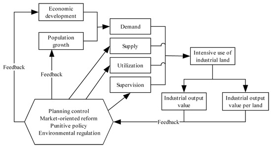 The IUIL cannot deviate from the most basic goal of industrial production to increase the output of industrial land. That is to say, the first goal of intensive use is to raise the total industrial output and then improve marginal output. With this prerequisite, the feedback loop of the intensive land use system can be described as the supply and utilization of industrial land driving economic development, providing more employment opportunities, and attracting foreign populations. At the same time, the increase in population will further promote economic development, generate new demand for industrial land, and affect the supply and utilization pattern of land, which influences the intensive land use system and, in turn, feeds back to governments. The governments implement policies targeting the supply side, utilization side, and supervision side to optimize resource allocation. The change in resource allocation eventually affects the balance of supply and demand of industrial land (see