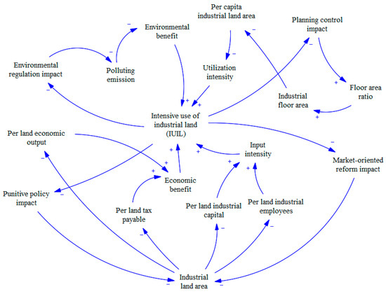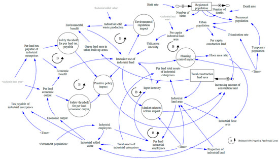 As we mentioned above, the connotation of intensive utilization is broader, which refers to maximizing economic and ecological values through the increased input of production factors. In this study, input intensity, utilization intensity, economic benefits, and environmental benefits are incorporated into an index system to measure IUIL. Considering policy impact, the main causal feedback relationships of the intensive use of the industrial land system are as follows (also see