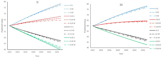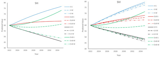 Figure 4 presents the scores obtained for the input intensity (II), utilization intensity (UI), economic benefit (EcB), and environmental benefit (EnB) of industrial land under different scenarios and varying policy impact intensities. For example, II-S, II-M, and II-W represent the changes in input intensity under strong policy impact, moderate policy impact, and strong policy impact, respectively.