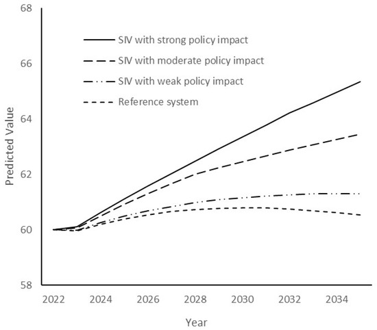 In this system dynamics simulation, 2022 was set as the initial year of the simulation. For comparison, the actual values of the variables in 2022 in the IUIL subsystem were set as reference values, and the scores were recorded as 60. That is to say, the score of the IUIL of industrial land use in 2022 is 60. The relative values of other indicators of the calendar years (2023−2035) were transformed by dividing by the 2022 values to compare the simulation results. The simulation time step was one year. In the reference system, all scenario variables were not enabled. See