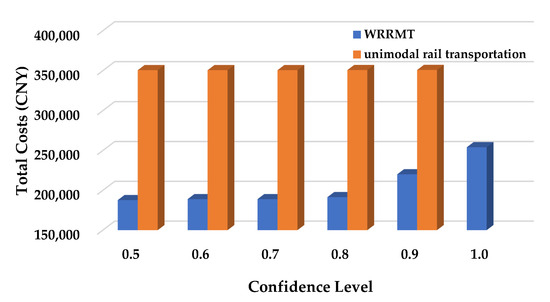 - The MTO should pay attention to the capacity stability of the carriers and terminal operators in the water–rail–road multimodal transportation network. After receiving the transportation order of time-sensitive goods, the MTO should use these with adequate and stable capacities at a high priority to build the transportation network, so that the uncertainty degree of the uncertain capacity of the network can be reduced. This suggestion is also emphasized by Ge and Sun [20] in the MRP for regular goods.