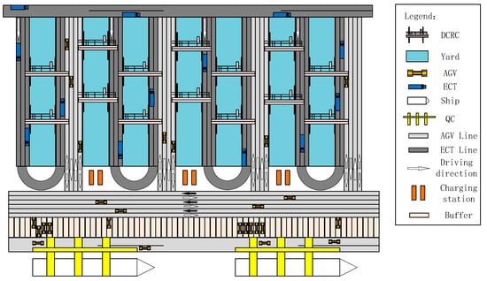 The layout of the ACT system, including the berth line layout that determines the location of the quay crane, the layout of the yard involving the location of the yard crane, and the block and path of the AGV, has a significant impact on the performance of ACTs [3]. AGV paths vary under different yard layouts. With the advancement of carbon neutrality strategies and the emergence of large container vessels, ACTs are at a pivotal stage of energy-saving, decarbonization, and intelligent transformation [4]. In this context, automated terminals have widely adopted electrically powered AGVs. However, due to the limitation of battery capacity, AGVs must proceed to charging areas for power replenishment when their battery levels drop below a certain threshold. The different charging methods and the layout of power supply equipment influence the duration of AGV power replenishment. Uncertainty in charging time can result in unpredictable loading and unloading times, affecting the synchronization of equipment and the overall operational efficiency of the terminal.