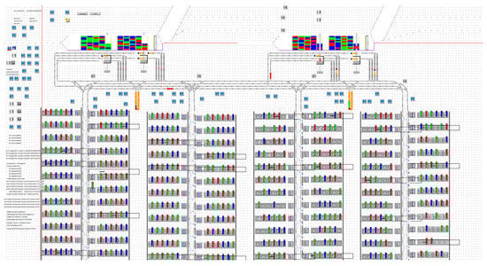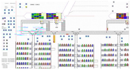 The simulation model of the U-shaped ACTs was developed using Siemens Tecnomatix Plant Simulation 15.0, as shown in Figure 2. The modeling process leverages the built-in components of the simulation software and the integrated SimTalk language to simulate various operations in the terminal. The multiple operations include unloading containers from the ship to the AGV via quay cranes, AGVs waiting in the buffer zone for loading and unloading, transporting containers to the designated yard locations, and moving containers in the yard via a yard crane. The simulation process can be divided into four main modules, the quay crane module, yard module, AGV module, and charging module, each with corresponding function files.