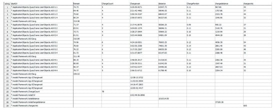 This module includes the AGV class and AGV roadway modules. The AGV class is responsible for generating different AGV fleets and contains functions for tracking the status of each AGV. When an AGV is generated, it is assigned a fixed loading/unloading location. If the number of AGVs under a quay crane is less than two, the AGV prioritizes picking up a container from that quay crane; otherwise, it heads to its designated loading/unloading place. During the simulation, AGV status can be accessed in real time, and the collected information is summarized in an Excel sheet, as shown in Figure 3. The AGV roadway module includes the paths that AGVs follow between the quay cranes and the yard. This path can be divided into the quay-side AGV waiting buffer area, the horizontal transport area between the quay cranes and the yard, and the AGV paths inside the U-shaped yard between different yard blocks. When an AGV has no charging task and has completed unloading in the yard, and the quay crane unloading place is busy, the AGV moves to the waiting buffer area. After collecting a container from the quay crane, the AGV leaves the quay crane unloading place and enters the horizontal transport area, which connects all yard blocks and quay cranes. The AGV selects the path based on the principle of the shortest route. Upon entering the designated unloading place in the yard via the left-side travel lane, the AGV completes the unloading task and then turns around to exit the yard via the right-side travel lane.