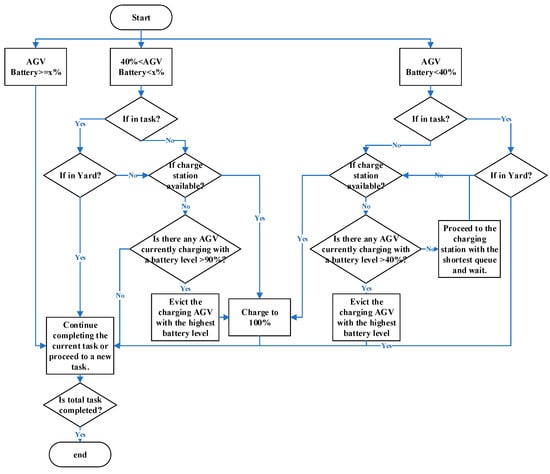 The charging module includes the charging pile and AGV charging strategy modules. In Figure 2, the orange lanes represent the charging piles. AGVs can enter the charging piles via the horizontal transport area for recharging. The charging pile module outputs the number of AGV charging events and the AGV charging waiting time. The charging strategy used by the AGVs in the simulation is shown in Figure 4. This strategy is embedded into each AGV’s charging control through the charging strategy module, allowing for real-time modification of the charging threshold by accessing global variables, which lays the foundation for algorithm integration.