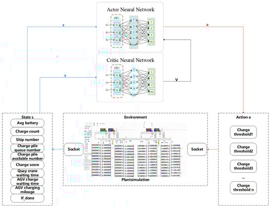 The deep neural network is shown in Figure 6. In the simulation model, the AGV module automatically retrieves relevant state information S, which is input into the policy and value networks. The input layer of both networks consists of a GRU structure, which processes the state information and outputs the final hidden state ht to the hidden layer. The policy and value networks have only one hidden layer, with a dimension of 128*64. The output of the policy network represents the charging threshold for the AGV charging strategy, while the output of the value network estimates the advantage of the current state. The parameters of the policy and value networks are denoted by θ and ζ, respectively. During training, these parameters are continuously optimized through the objective function. The objective of the iterative training is to ensure that the charging thresholds generated by the policy network align with the current working conditions of the ACTs, thereby preventing inefficient charging behaviors.