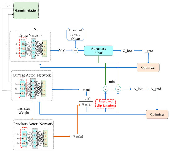 - To meet the simulation optimization requirements for AGV charging in U-shaped ACTs, we improved the PPO algorithm’s neural network and clipping function to enhance convergence speed and reduce training time in large-scale simulation scenarios. By utilizing the ability of the Gated Recurrent Unit (GRU) to leverage historical state information, a GRU structure was incorporated into the PPO deep neural network to extract temporal correlations from input state information. The GRU enables the algorithm to learn patterns in terminal working condition variations from historical data and apply them to decision-making. To address the clipping function in the PPO algorithm that fails to effectively constrain the ratio of new to old policies’ probability updates within the specified range, we improved the clipping function by utilizing a hyperbolic tangent function. This adjustment ensures that the ratio of policy updates is constrained within the designated limits while facilitating smoother and more natural transitions between the old and new policies.