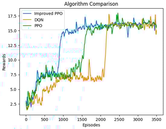 DQN, PPO, and the proposed improved PPO are compared during training, with the hyperparameters for each algorithm listed in Table 2. The training process is conducted on a computer with an i5-12600KF CPU @ 4.90 GHz and with 32 G RAM. The reward curves for model training are shown in Figure 9. Owing to the introduction of the GRU structure, which enables the improved PPO to utilize historical information more effectively, the proposed method demonstrates faster convergence compared to PPO and DQN.