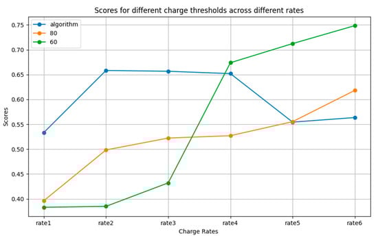 As shown in Figure 10, the proposed charging strategy outperforms the fixed charging threshold strategy at charging rates 1, 2, and 3. At charging rate 4, the proposed method performs similarly to the strategy with a fixed 60% threshold, while at charging rates 5 and 6, the fixed 60% threshold strategy delivers the best results.