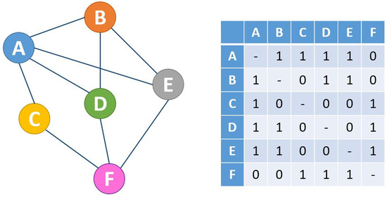 Relational thinking has its most fundamental mathematical counterpart in the concept of a network. A ´network´ is not necessarily a ´real´ thing; rather, it must be considered a ´cognitive schema´ [29], which is an abstract collection of concepts used to make sense of the unknown world of life. In other words, a network is a formal system arising from the correlation structure of the studied system that can eventually be decoded in terms of the original natural system interaction pattern. A network (graph) structure is fully described by its adjacency matrix, isomorphic to the usual node-and-edge representation (Figure 2).