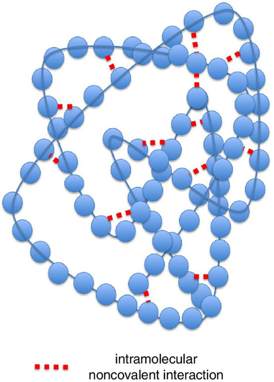 Spheres = amino acid residues; continuous blue line = covalent bond series responsible for the primary structure; dashed lines = noncovalent (weak) interactions between residues distant in the sequence put in contact by folding process (modified from [30]).