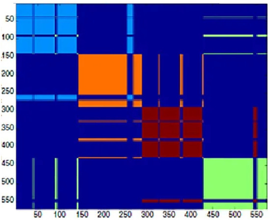 The adjacency matrix was colored by a spectral-clustering procedure [33], with specific color points corresponding to residues having a much higher number of contacts between them than with other nodes of the network and blue areas being devoid of intermolecular contacts. As expected, the clusters approximately correspond to residues located nearby along the sequence, pointing to the highly modular structure of the hemoglobin PCN. The long ‘whiskers’ evident in the figure as ‘displaced contacts’ (e.g., the 250–270-residue patch having the majority of contacts with the ‘blue’ cluster instead of the orange one ‘nearer’ in the sequence) correspond to the so-called ‘fast lanes’ of communication responsible for allosteric signaling. The ‘whiskers’ can be quantified in terms of the ‘participation coefficient’ (P) corresponding to the proportion of edges starting from node i and ending up in node j pertaining to a different cluster. A perturbation affecting specifically a ´high-P´ node travels a long distance across the network, passing by subsequent ´high-P´ nodes and arriving at the destination (the active site), thereby supporting allosteric effects. On the contrary, generic (noisy) thermal motion rapidly dissipates, distributing across non-directional cycles through intra-module motions. High-P nodes create a ´fast lane´ for relevant information neatly separated by noise. This finding, initially coming from hemoglobin analysis by a purely data-driven procedure (the only input data being the pairwise distances between residues coming from X-ray spectrographs), was experimentally corroborated by the simple inspection of the role of high-P nodes not present in other protein systems [34,35]. Moreover, in networks having completely different constitutive laws (e.g., genetic regulation networks where nodes correspond to the expression levels of different genetic elements), high-P elements play the same role of fast and reliable fast lanes for information transfer [36].