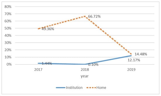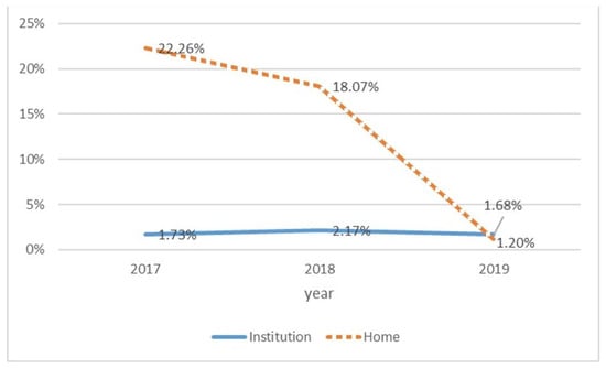 Figure 1 and Figure 2 illustrate the pattern of slack ratios of the number of old age being serviced in institutions or those being serviced in homes in the SBM and DSBM models, respectively. We find that the number of elderly being serviced in homes has a larger potential capacity than those who have been serviced in institutions in 2017 and 2018, with no difference between the SBM and DSBM models. In 2019, the potential capacities for the number of elderly serviced in institutions and homes are similar. Going into more detail, the potential capacity for the number of elderly serviced in homes is falling. This result implies that the number of old age serviced in their homes sharply increased in 2019, which caused their potential capacity to drop sharply. It may be a warning sign that LTC services in homes are approaching low capacity, which is similar to LTC services in institutions. We suggest that the capacity of LTC services in homes should be higher than that in institutions since LTC services in homes are the first defense line for elderly people with LTC needs, while LTC services in institutions are the final defense line for those with LTC needs.