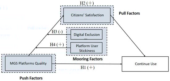 Therefore, in response to the practical need for optimizing MGS, this paper explores the factors influencing citizens’ intentions for continued usage of mobile government service platforms from the perspective of citizen demand, using the Push-Pull-Mooring (PPM) theoretical framework. Citizens’ intentions for continued usage represent a critical measure of the effectiveness of MGS [,], and their ongoing use and feedback contribute to the optimization of service processes and quality improvement [,]. Drawing on the DeLone and McLean Information System Success Model (D&M) and the Expectation Confirmation Model (ECM), this study examines the impact of platform quality on citizens’ continued usage intention from three dimensions: system quality, information quality, and service quality. Furthermore, it investigates the mediating role of citizen satisfaction as well as the moderating effects of digital exclusion and platform user stickiness on this relationship. The study constructs a PPM theoretical framework for continued usage intention, arguing that platform quality serves as a push factor, citizen satisfaction as a pull factor, and digital exclusion and user stickiness as mooring factors. This research enriches the theoretical understanding of citizens’ continued usage intention in MGS. The findings offer policy insights for government departments to further improve MGS, enabling more efficient responses to citizen needs and enhancing citizen engagement with online government services.