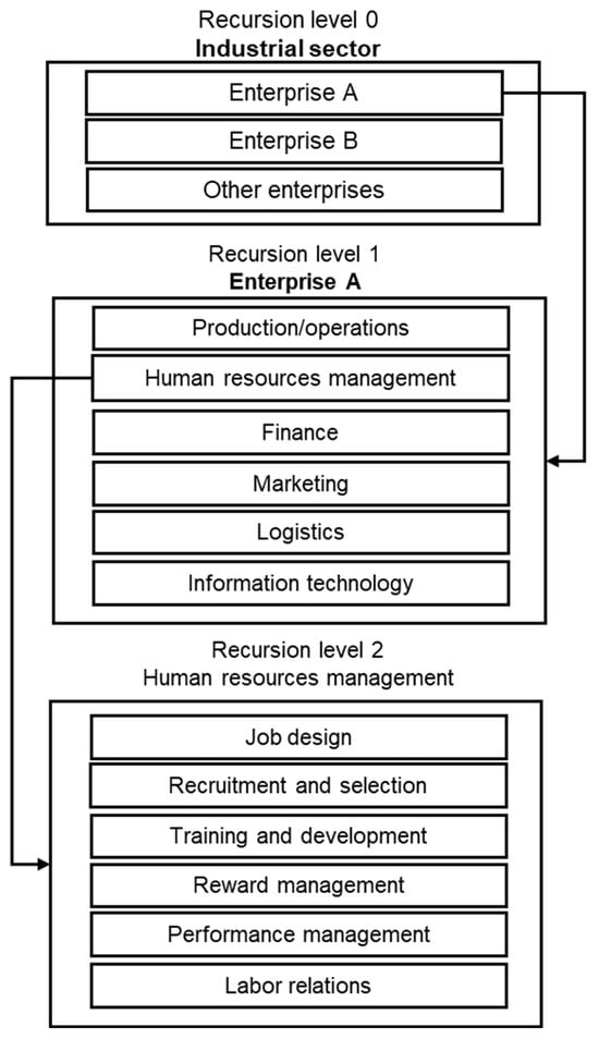 Three levels of recursivity are proposed [30]. At Level Zero, the suprasystem is considered, which is the industrial sector to which the company belongs. At Level One, regarded as the “focal system”, is the company itself, along with its most common subsystems (often referred to as areas or departments): HRM, marketing, production, finance, logistics, among others. At Level Two of recursivity, a subsystem of Level One is considered, HRM, encompassing its primary processes or activities [8,52,53,54]: job design, recruitment and selection, training and development, compensation management, performance management, and labor relations.