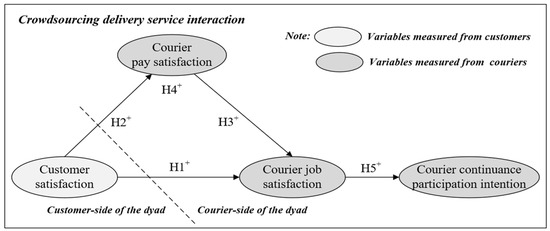 This paper aims to illuminate how courier–customer interactions affect courier continuance participation intention using a dyadic analysis with matched data from the Dada platform in China. Applying the balance theory, we propose that courier job satisfaction is positively affected by customer satisfaction. Furthermore, pay satisfaction is introduced as a mediator in the courier–customer satisfaction link, drawing upon the distributive justice theory. Thus, we examine the mutual influence mechanism of courier satisfaction and customer satisfaction and its subsequent influence on courier continuance participation intention. Therefore, this study is expected to make theoretical contributions in the following three ways. First, we focus on crowdsourced courier continuance participation intention, which enriches studies on employee turnover or retention even in the flexible employment market of crowdsourcing delivery. Second, using the balance theory and distributive justice theory, it explores the inherent influence mechanism of the impact that customer satisfaction has on courier job satisfaction, in which courier pay satisfaction plays a mediating role, thereby influencing courier continuance participation intention. Third, due to the interdependence of customers and couriers in delivery service interactions, we employ a dyadic data analysis, which remedies the extant literature that has mainly focused on the vantage of customers or employees by integrating their perspectives simultaneously [33].