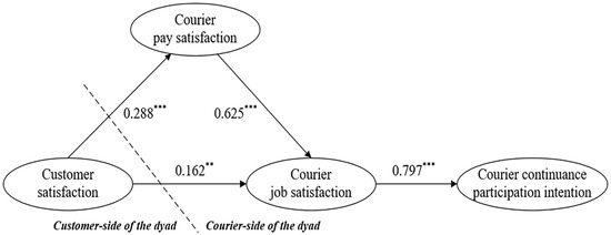 Drawing on the balance theory and distributive justice theory, this study, based on a dyadic analysis, strives to reveal how a customer–courier interaction influences courier continuance participation intention in crowdsourcing delivery. More specifically, we examined the direct effect of customer satisfaction on courier job satisfaction, tested the mediating role of courier pay satisfaction, and verified the association between courier job satisfaction and continuance participation intention in the Dada case. Getting a better understanding of the above relationships could help crowdsourcing delivery platforms address the issue of high courier turnovers and contribute to the sustainability of the crowdsourcing industry. Several key findings are summarized as follows.