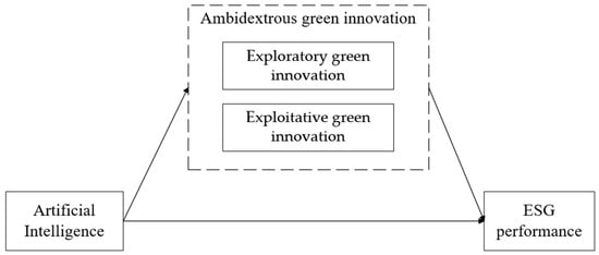 With the rapid development of the ESG connotation, ambidextrous green innovation has become a new norm for industry development. Ambidextrous green innovation, while pursuing corporate development and economic growth, focuses more on improving natural resource utilization and reducing environmental pollution emissions through technological, product, and process innovations, etc. []. Ambidextrous green innovation is a crucial manifestation of ESG and is essential for enhancing corporate competitiveness and creating a sustainable circular economy pattern []. However, the unique knowledge spillover and dual external attributes of environmental protection of ambidextrous green innovation [], combined with the inherent long-term and high uncertainty of traditional innovation [], determine the difficulty for manufacturing enterprises to implement ambidextrous green innovation. At this point, AI can leverage its characteristics such as digitization, intelligence, openness, and sharing to provide new development opportunities for enterprises, promote ambidextrous green innovation in manufacturing enterprises, and enhance their ESG performance. Ambidextrous green innovation in enterprises can be divided into exploratory green innovation and exploitative green innovation [], clarifying the differences and connections between different types of green innovation driving paths, and helping enterprises carry out targeted ambidextrous green innovation activities based on their conditions [].