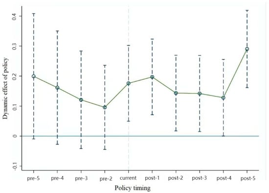 The fundamental prerequisite for a valid DID estimation is the requirement of parallel trends between the treatment and control groups before the policy intervention. Following the approach adopted by scholars such as Lv et al. (2019) [], this study employs an event study methodology to meticulously investigate the trend evolution of both groups. To mitigate multicollinearity concerns, the period immediately preceding the policy implementation is excluded from the analysis. The regression results, depicted in Figure 2, reveal that before 2017, non-significant outcomes prevailed, indicating the absence of any substantial disparity between the treatment and control groups. Notably, a significant divergence in ESG performance emerges in the treatment and control groups coinciding with and after the policy onset. Although there was a slight decline during the COVID-19 pandemic from 2019 to 2021, which inflicted severe shocks on the economy, China’s economy rebounded resiliently in 2022, overcoming internal difficulties, with the economy recovering and industries advancing solidly towards high-quality development. This suggests that there is a clear upward trend in the dynamic effect of the policy’s implementation in promoting AI-driven improvements in the ESG performance of manufacturing firms, satisfying the parallel trend hypothesis.