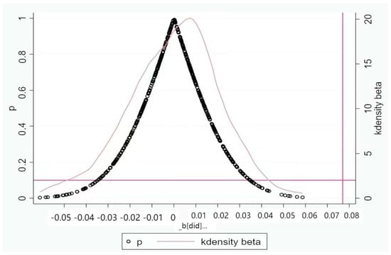To address potential endogeneity issues, this study set the sample period from 2012 to 2017, randomly set the year of the initiative to 2015, and then generated new treatment and control groups for a placebo test. To improve the identification capability of the placebo test, 500 regression runs were repeated, with the results shown in Figure 3. From Figure 3, it can be observed that most estimates in the “pseudo-treatment group” are concentrated in the range of −0.05 to 0.05, while the true estimate is 0.077. The majority of p-values exceed 0.1, indicating non-significance at the 10% level. This signifies that our true estimate is an outlier and cannot produce significant estimation results by random simulation. This further substantiates the notion that the policy implementation has exerted a pronouncedly facilitative effect on the ability of AI to enhance the ESG performance of manufacturing firms, enhancing the reliability of this study’s conclusions.