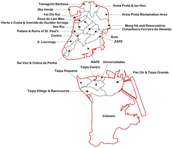 Macao had a total population of 672,800 by the end of 2022, according to the seventh National Census Bulletin released by the National Bureau of Statistics [24]. According to the data from the Statistics and Census Service of Macao, the population density of Macao in 2022 was 20.6 per 1000 square kilometers, making it the highest populated density globally. Given this exceptionally high density and in line with recent research [25], Macao was selected as the study location to examine the implementation of PHE in densely populated urban environments. The study encompasses 23 distinct areas across the four regions of the Macao Peninsula, Taipa, Coloane, and Cotai City (Figure 1). Figure 1 provides a visual representation of the geographic distribution of these areas. Before selecting the sites for field investigation, we conducted research on relevant CPSIs through literature reviews and the official website of Macao. After considering factors such as types of institutions, target populations, and affiliations, a total of 40 sites were ultimately selected as survey locations for this study.