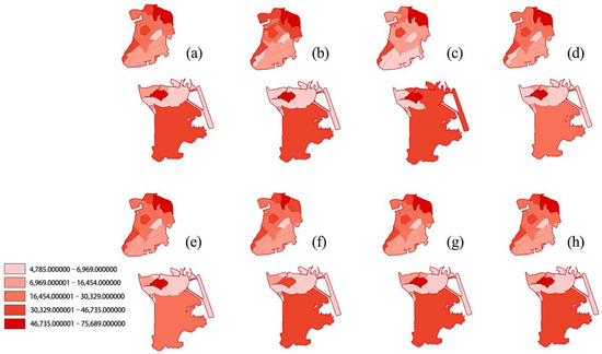 From the perspective of the regional distribution of the Macao population, the resident population is mainly concentrated in the northeast side of the Macao Peninsula, the central area of Taipa, and the areas of Coloane and Cotai City (Figure 2a). From the perspective of age distribution, the population distribution in the age group of 0–14 years is essentially identical to that of the total population (Figure 2b). The population aged 15–24 is mainly concentrated in the northeast and southwest of the Macao Peninsula, as well as in Taipa, Coloane, and most areas in the east of Cotai City (Figure 2c). The number of people aged 25–44 and 45–64 is the largest, and the population distribution is the same as the total population (Figure 2d,e). The number of people over 65 years of age aligns with the general population trend (Figure 2f). The regional distribution of males and females mirrors that of the total population, although females are proportionally more numerous than males (Figure 2g,h). According to the international standard for the proportion of the elderly population, which is the percentage of the population aged 65 and above in the total population reaching more than 7% as a criterion for a country or region to be classified as an aging society, Macao’s proportion has reached 12%, surpassing the standard by almost half. It shows that Macao, like most developed regions and countries, has entered an aging society.