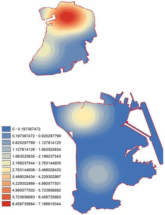 According to the Statistics and Census Service of Macao, the total population of Macao as of the first quarter of 2024 is 686,400. According to the 2021 Macao Census data, there are 72 institutions related to public health and social services in the Macao Peninsula, Taipa, Coloane, and Cotai City. On average, each region has about three social service agencies related to public health, with an average of one public service agency per 9533 people. Among them, 43 CPSIs are dedicated to serving the elderly, representing half of all service institutions. This highlights the significance of the elderly population in public services. Based on the heat map illustrating the number of CPSIs in Macao (Figure 3), it is evident that, when considering the regional distribution of the resident population in Macao, although both the Macao Peninsula and Taipa have high-density populations, the CPSIs are more concentrated in the northern area of the Macao Peninsula.
