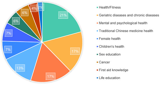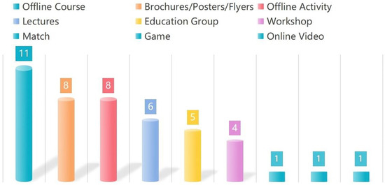 The means of health education can be mainly divided into two categories: offline and online formats. The online format mainly consists of videos, games, and online lectures. The offline format primarily includes in-person courses, brochures, posters, leaflets, educational groups, workshops, lectures, and offline participation activities. The most widely used approach is to offer offline health education courses to the public. A total of eleven institutions offers in-person health courses to the public, including long-term and short-term options. These courses may be either free or paid. Additionally, free brochures, leaflets, and posters are provided to the public in CPSSs. Eight institutions provide free health promotion materials to the public in CPSSs. This format is fast and convenient, achieving the purpose of health education to the public with the least labor and time cost, and is widely used in CPSSs. In addition, eight institutions offer in-person health education activities to the public. Offline health education activities come in various formats and tend to be more interactive and engaging than traditional courses or reading health materials. This makes them a more popular and acceptable format of health education for the public (Figure 5).