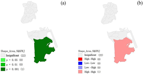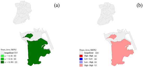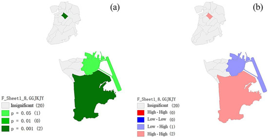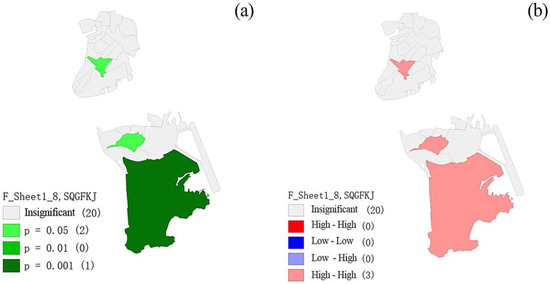 The scatter plot of the Moran index concerning the regional area and the population of residents aged 65 and over, as illustrated in Figure 6, reveals a Moran’s I = 0.055. This indicates a slight positive spatial autocorrelation between the regional area and the population of residents aged 65 and older. The results of the LISA significance level diagram (Figure 7a) and the clustering diagram (Figure 7b) indicate a significant clustering pattern in the regions of Coloane and Taipa at a 99% confidence level (p = 0.001). This “high-high” relationship demonstrates a positive spatial correlation, suggesting a certain degree of association between the elderly population and spatial distribution in these two areas.