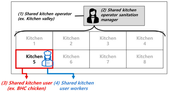 With the emergence of new shared-kitchen businesses and the expansion of this sector, food safety management has gained increasing importance [3,5]. By design, and in addition to overall food safety management, shared kitchens are exposed to the risk of cross-contamination of kitchen facilities and food owing to the multiple users. For instance, the U.S. Food and Drug Administration (FDA) has defined scenarios where hazard analysis and critical control points (HACCP) standards must be applied in shared kitchens. The FDA’s “HACCP implementation in a shared kitchen environment” report delineates the roles and responsibilities of shared-kitchen users and operators, guiding HACCP application within these spaces “https://www.studocu.com/ph/document/access-computer-college/hospitality-management/haccpimplementationinasharedkitchenenvironment2019/70820544 (accessed on 1 May 2019)”. Similarly, the Korean Ministry of Food and Drug Safety has instituted legal frameworks for shared-kitchen operations, encompassing safety management and insurance requirements. A specialized system has also been introduced, allowing shared-kitchen facilities to receive HACCP certification tailored to their unique operational needs.